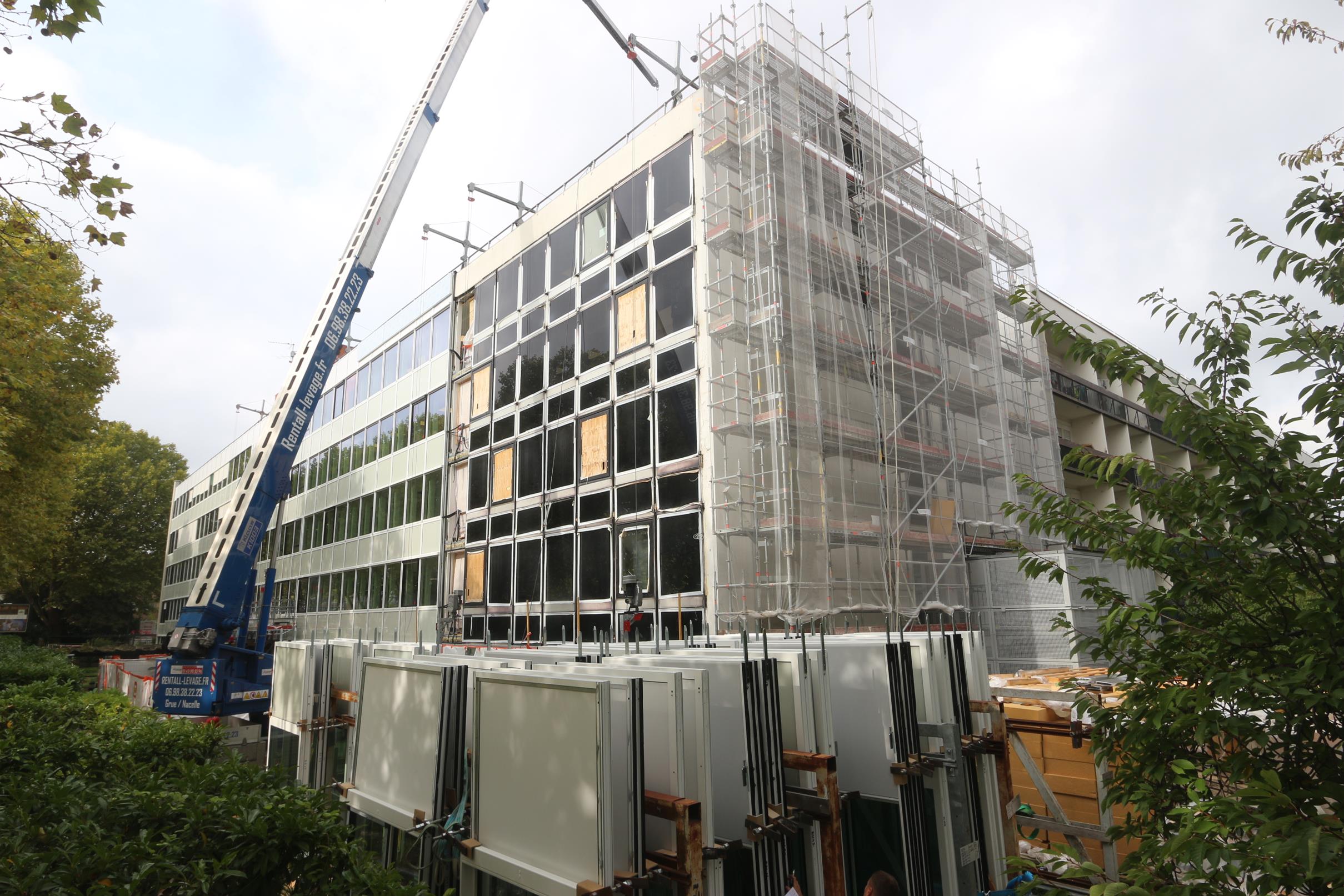 L’ensemble des façades a été entièrement repensé dans une démarche de rénovation à haute performance écologique, contribuant à la modernisation durable du bâtiment.